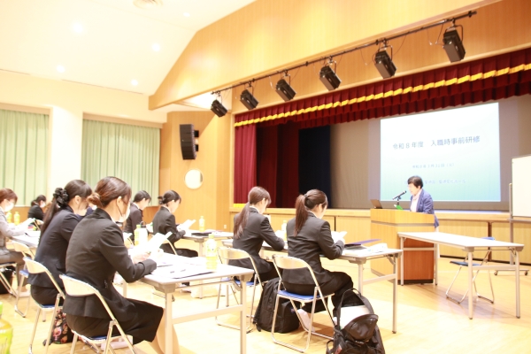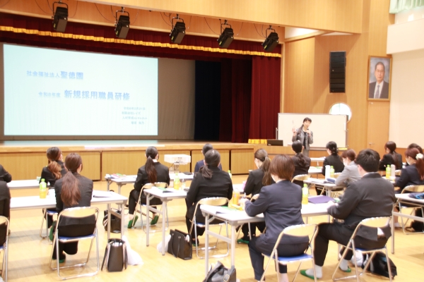 3月31日(火)聖徳文化ホールにて、4月より入職する新入職員を対象として、法人全体での入職前の事前研修を行い、高齢・保育教育・障がい・通所・芦原施設から計20名が参加しました。