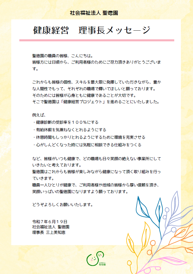 【健康経営】推進方針・実行計画・理事長メッセージを掲載しました