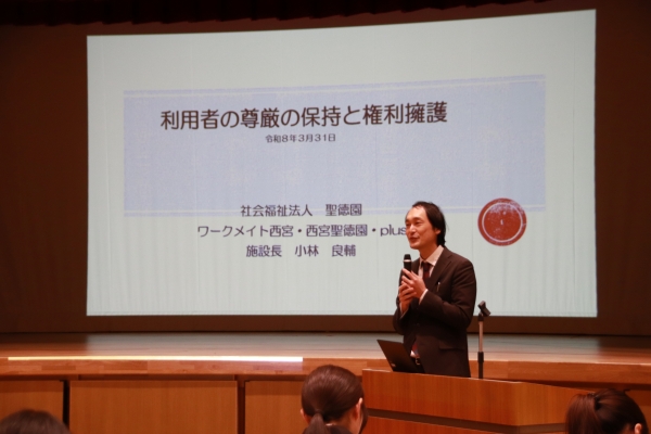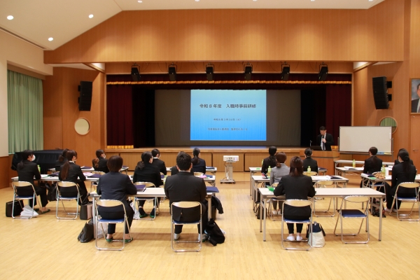 3月31日(火)聖徳文化ホールにて、4月より入職する新入職員を対象として、法人全体での入職前の事前研修を行い、高齢・保育教育・障がい・通所・芦原施設から計20名が参加しました。